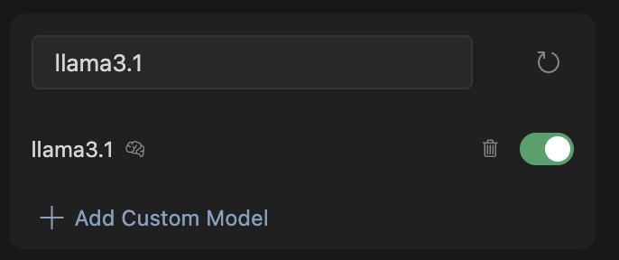 Add Custom Modelでllama3.1を追加して、ONになっていることを確認します。
