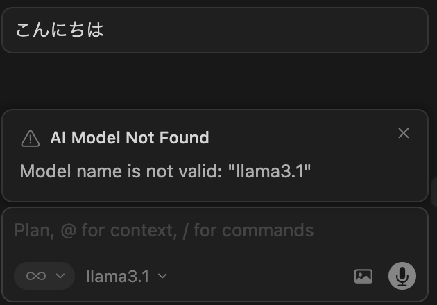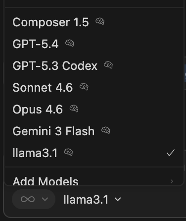 これで、Cursorのチャットパネルでllama3.1を選べるようになりました。