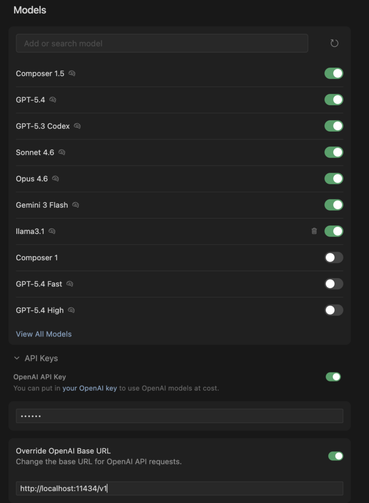 API Keysの中にある、「OpenAI API Key」を有効にして、値は適当に「ollama」などを入力しておきます。実際にOpenAI API Keyを使用する場合は併用できなさそうです。その下にある、「Override OpenAI Base URL」も有効にして、「http://localhost:11434/v1」と入力します。これでCursorからllamaに話しかけますが、ダメなようです。